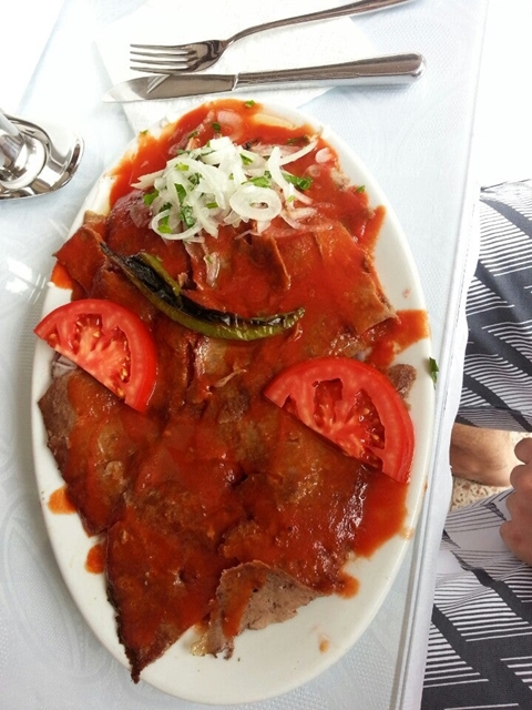 Döner; ince ince kesilip özel ekmeğin üzerine konularak tereyağı ve domates sosu ile servis ediliyor.